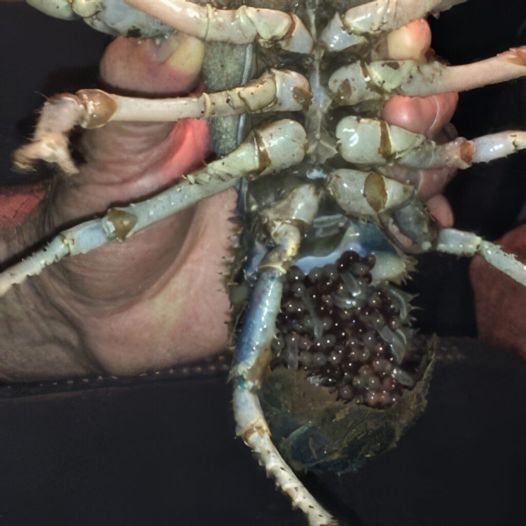 There is a mass spawning event and a clutch between 45 and 600 eggs are laid in early spring (November/December). The female carries the eggs attached to her abdomen, using her swimmerets to aerate them for a period of 6 – 7 weeks before they hatch. The hatched juveniles can remain attached to their egg case via a thread for another 2 to 3 weeks1.
