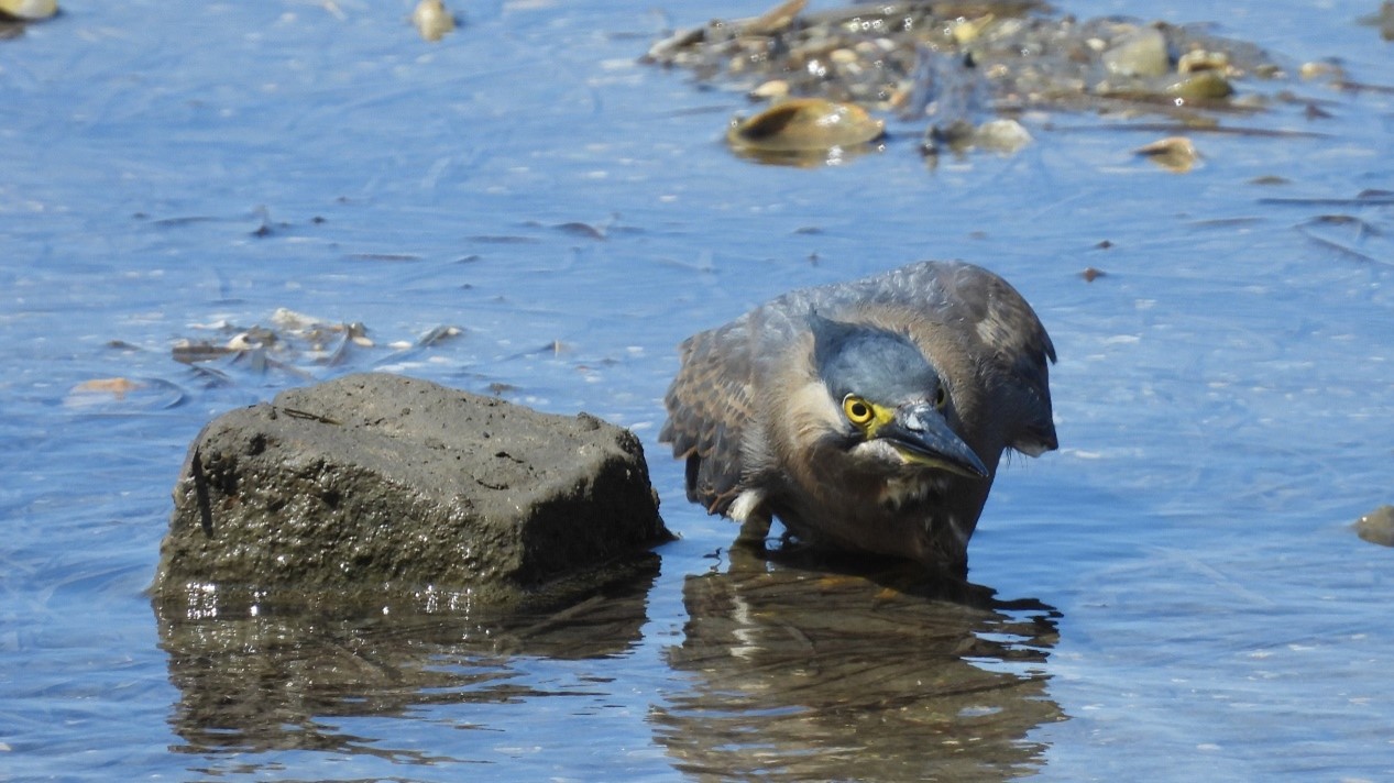 Behaviourally, striated herons use several hunting techniques that demonstrate impressive adaptability and intelligence. They are known to practice “stand-and-wait” hunting, staying motionless for extended periods before striking at passing fish. They either stand motionless or as can be seen in the video, maintain a crouched position parallel to the waterline, using rocks to remain hidden whilst actively stalking prey by moving slowly and carefully to avoid startling them.